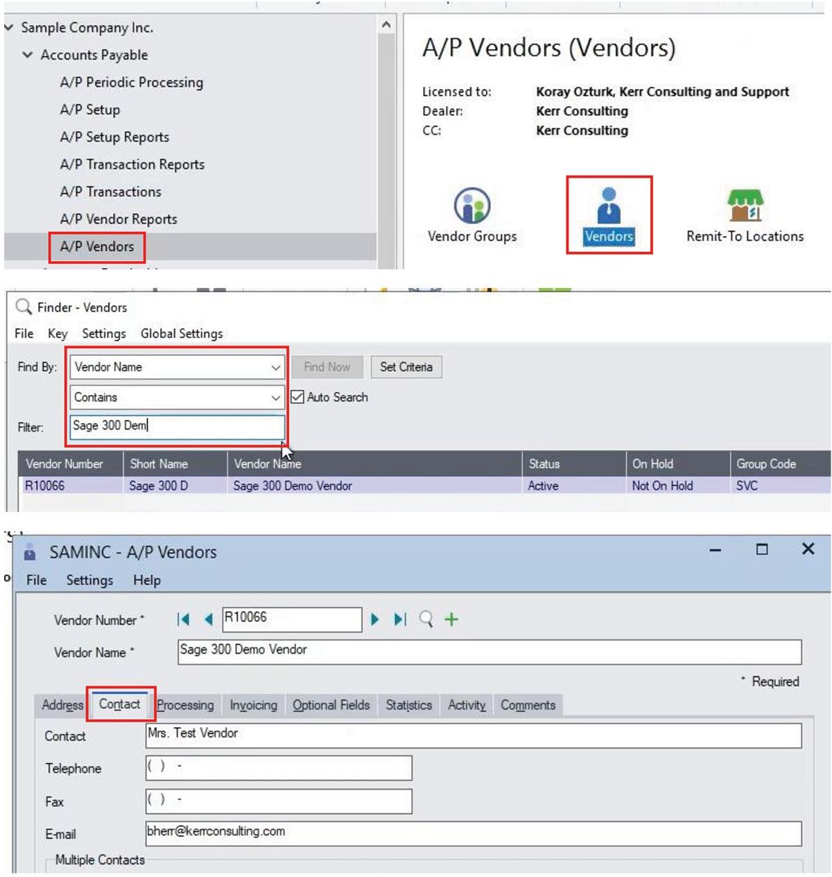 Head over to Sage 300 and navigate to the Accounts Payable (AP) Vendors section. Open the vendor list and search for the newly created “Sage 300 Demo Vendor.” Once located, you can verify the details, such as the vendor’s contact name (e.g., Mrs. Test Fender) and the email address entered in RAMP. The sync process ensures that all relevant vendor information is accurately transferred to Sage 300, ready for use