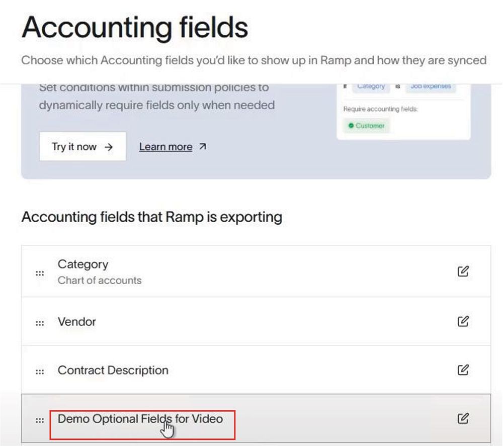 Next, open RAMP and navigate to: Accounting → Settings → Accounting Fields.