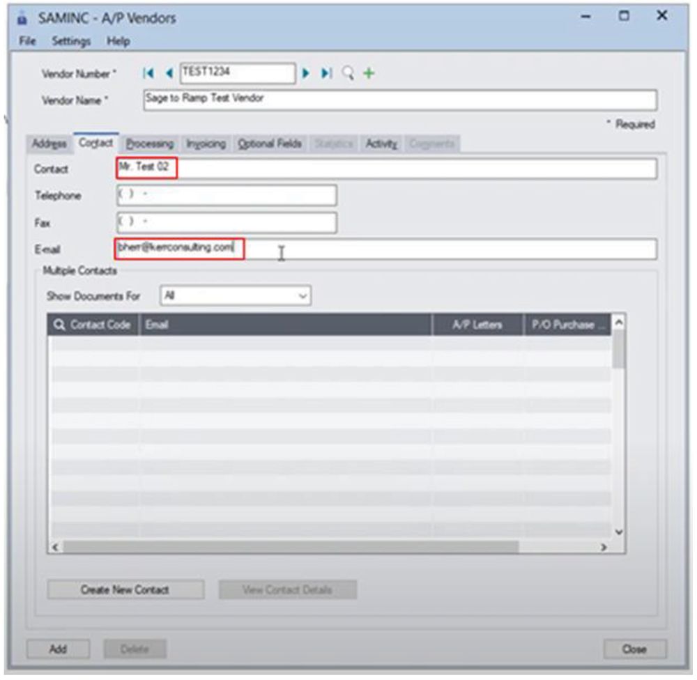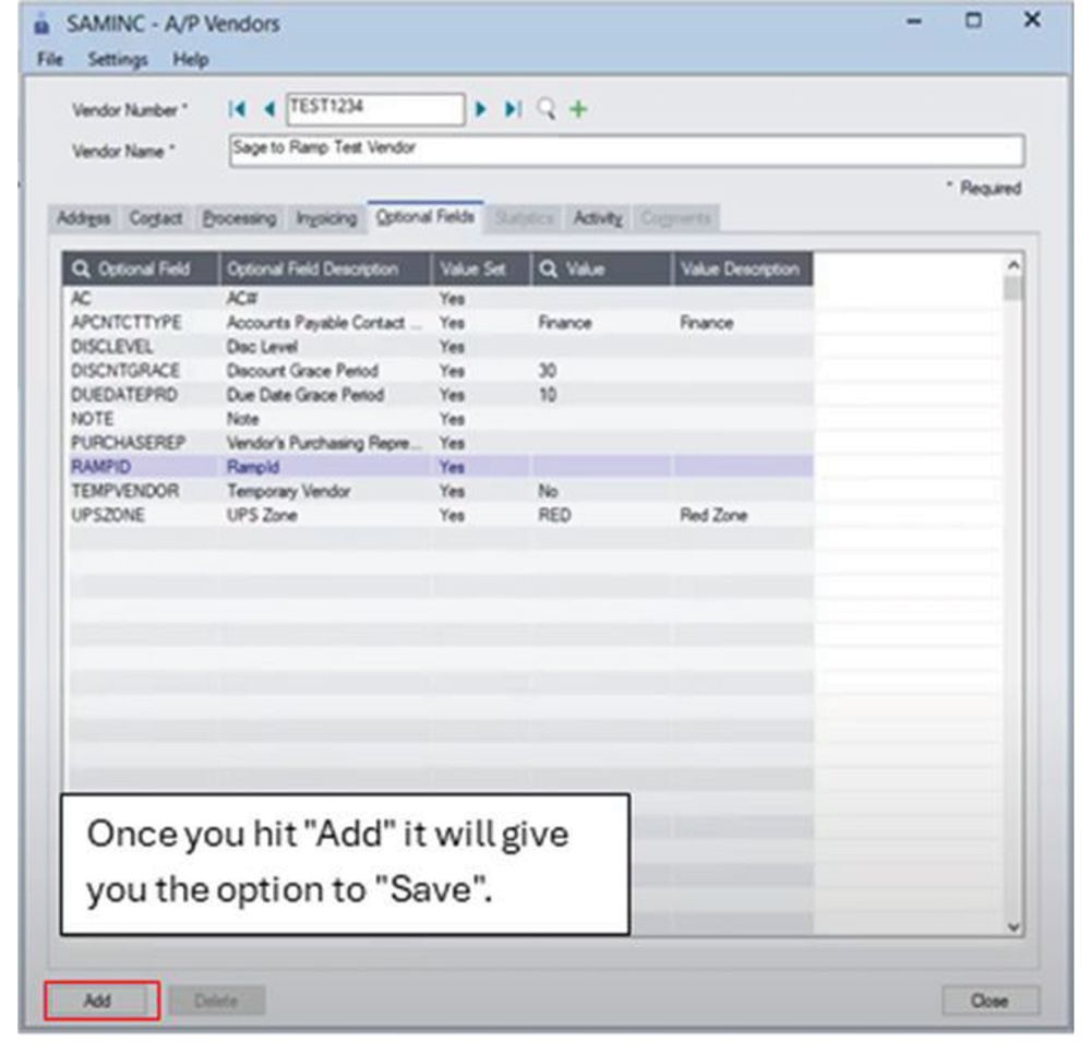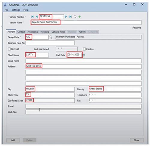 - Enter the Vendor Number and Vendor Name — in this case, “Sage to RAMP Test Vendor.”